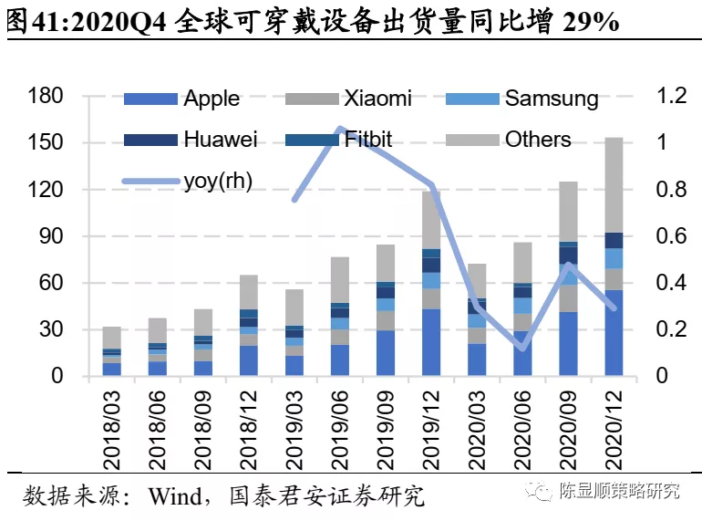 可穿戴设备:2020Q4全球出货量同比增29%,增速较Q3下降19个百分点。据IDC统计2020Q4可穿戴设备出货量达1.53亿件,同比增29%,增速较Q3下滑19个百分点。其中苹果、小米、三星和华为为前四大品牌,合计占据可穿戴设备六成市场,市占率分别为36.22%、8.79%、8.47%和6.64%,其中除了苹果市占率和实际出货量有所上升外,剩余三家市占率和出货量有不同程度下降。