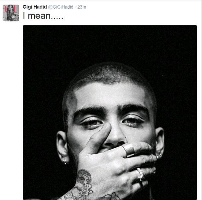 这名20岁的美人儿发了一张新男友泽恩·马利克(Zayn Malik)的帅照,配字:“我的意思是……”(I mean…)