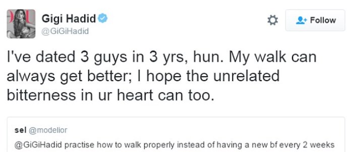 去年,推特上有人说吉吉·哈迪德作为一名模特“身材魁梧”,她不得不做出反驳。