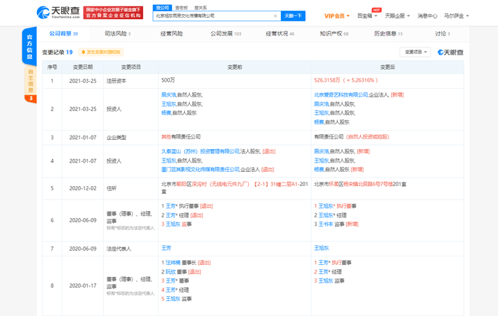 据天眼查APP显示,3月25日,旭东影业所属公司——北京旭东雨辰文化传播有限公司发生多项工商变更,股东新增北京爱奇艺科技有限公司,持股比例5%。同时,公司注册资本由500万人民币增至约526万人民币,增幅约5.26%。
