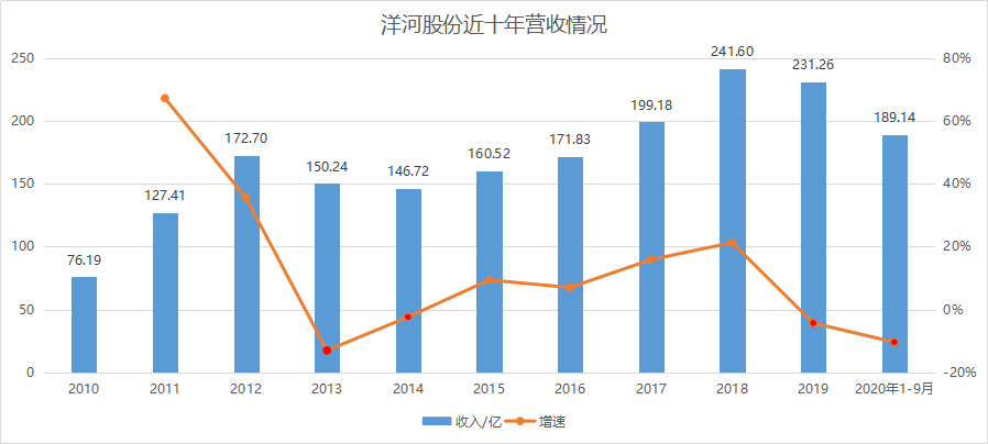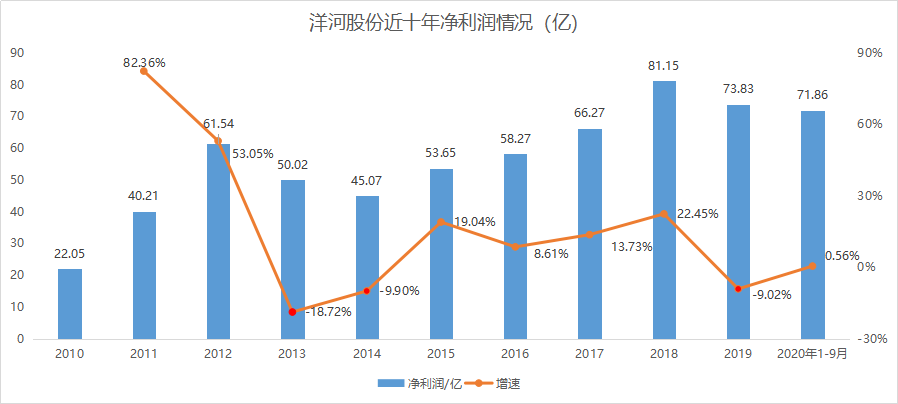 2013年,整个白酒行业遭遇抑制公款消费八项措施的重创,各家公司业绩几乎同时跌入低谷。2015年行业新一轮复苏开始后,洋河股份营收与净利也重新有了起色,2018年同步达到20%以上,之后,再次掉头向下。