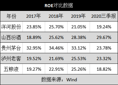 因此,相对于其他白酒TOP5公司近两年的风生水起,洋河股份可能是这轮白酒黄金周期最大的失意者。这一点,从白酒TOP5上市公司近几年净资产收益率上看得非常清楚。