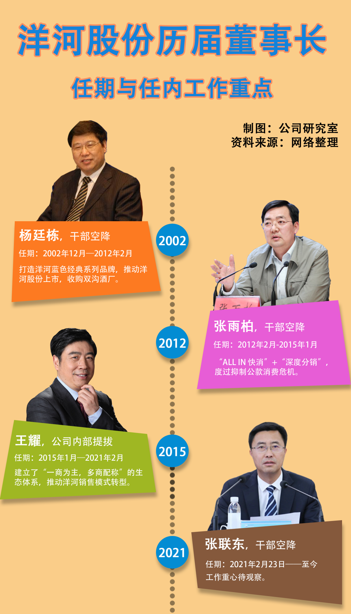 熟悉洋河成长历史的业内人士告诉公司研究室,洋河能在2000年代异军突起,关键是杨廷栋掌舵时,大胆推出海之蓝、天之蓝、梦之蓝的蓝色经典系列,并借助资本市场收购双沟酒业,从而奠定洋河股份从地方酒厂升级为全国性名酒企业的地位。