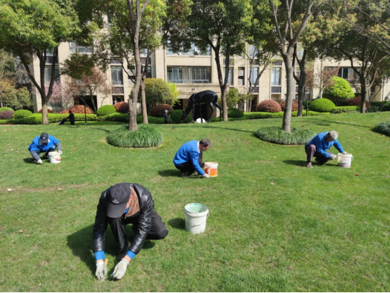 所以,小区设施上有没有灰尘,是我对它的“考核指标”之一 走着走着,刚好碰到有几名工人正在草地上除杂草。