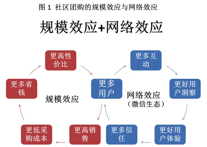 第二,社区团购具有规模效应。社区团购能够通过更多的用户形成更高销售、更低采购成本、更多省钱、更高性价比、更多用户的一个循环,从而带来规模效应。