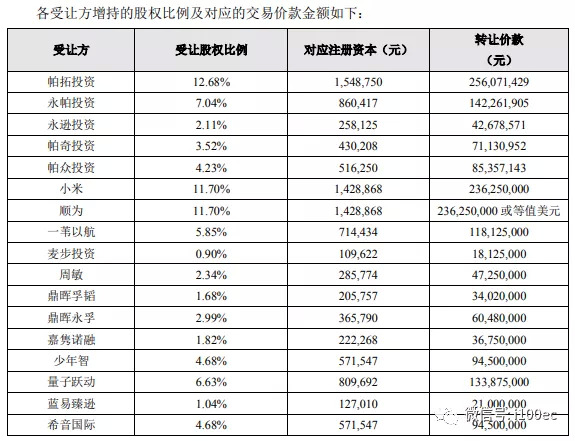公告显示,交易后,帕拓逊的股权结构为:帕拓投资12.68%、永帕投资7.04%、永逊投资2.11%、帕奇投资3.52%、帕众投资4.23%、小米11.70%、顺为11.70%、一苇以航5.85%、麦步投资0.90%、周敏2.34%、鼎晖孚韬1.68%、鼎晖永孚2.99%、嘉隽诺融1.82%、少年智4.68%、量子跃动6.63%、蓝易臻逊1.04%、希音国际4.68%、渊合投资1.04%、黄埔创融9.88%、帕友投资3.51%。