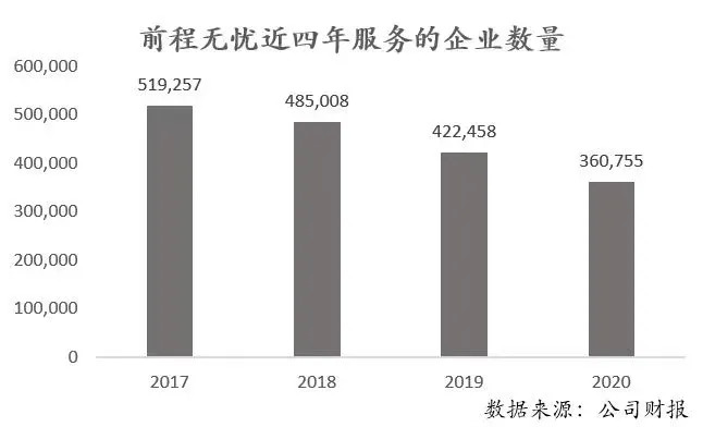 财报数据显示,前程无忧2020财年服务企业数量相较去年的42万家,大减了14.6%到36万家。而这个重要数字,竟然连续四年都在下降,去年的雇主流失率也是近年来最高的。