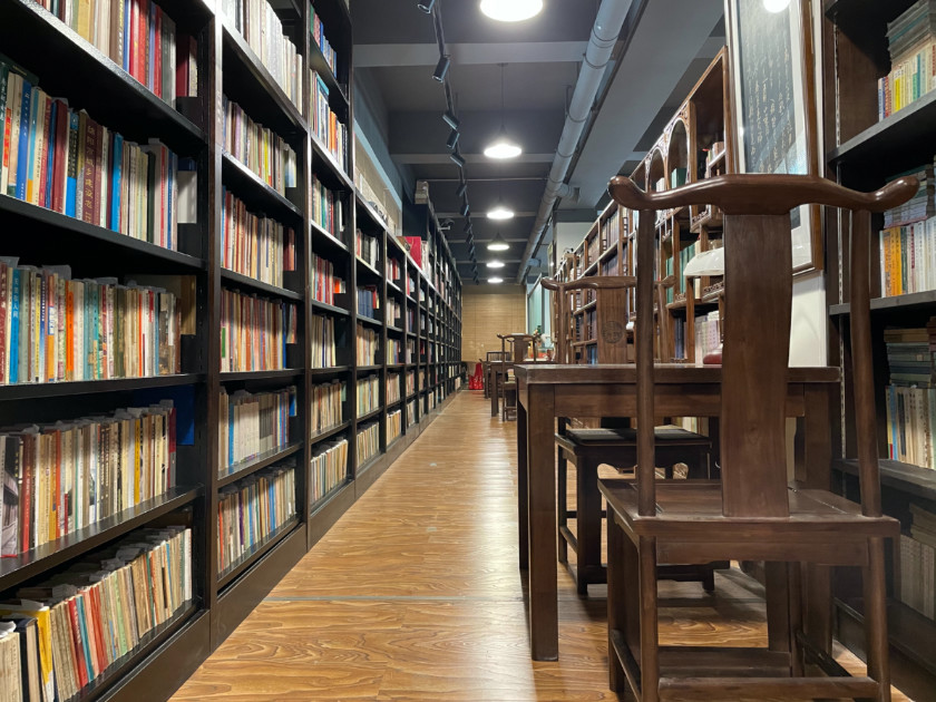 界面四川在现场看到,如今的毛边书局•桃蹊书院占地1500平方米,为一座三层仿古式的建筑空间,一层作为公共阅读空间,有80多个座位,分为少儿阅览区、电子阅览区,图书阅览区、报刊阅览区。二层是成都桃蹊画院所在地,引进了四川省美协副主席工作室和书画展厅,平常会定期举办国学讲堂,也举办一些摄影展及画展。