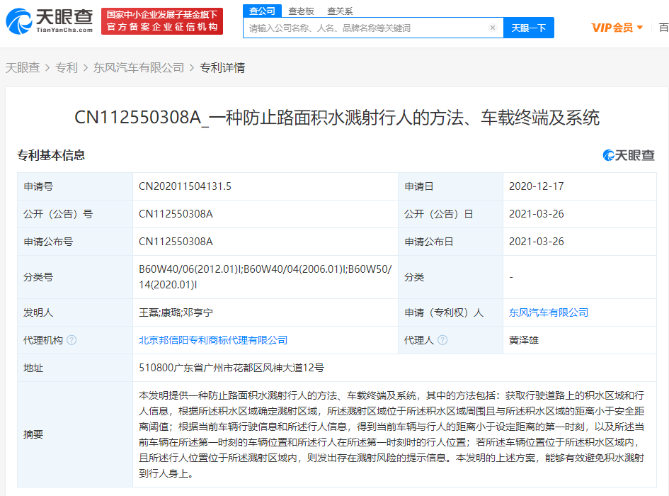 据天眼查APP显示,3月26日,东风汽车有限公司公开一项名称为“一种防止路面积水溅射行人的方法、车载终端及系统”的专利,公开号为CN112550308A,专利申请日期为2020年12月17日。