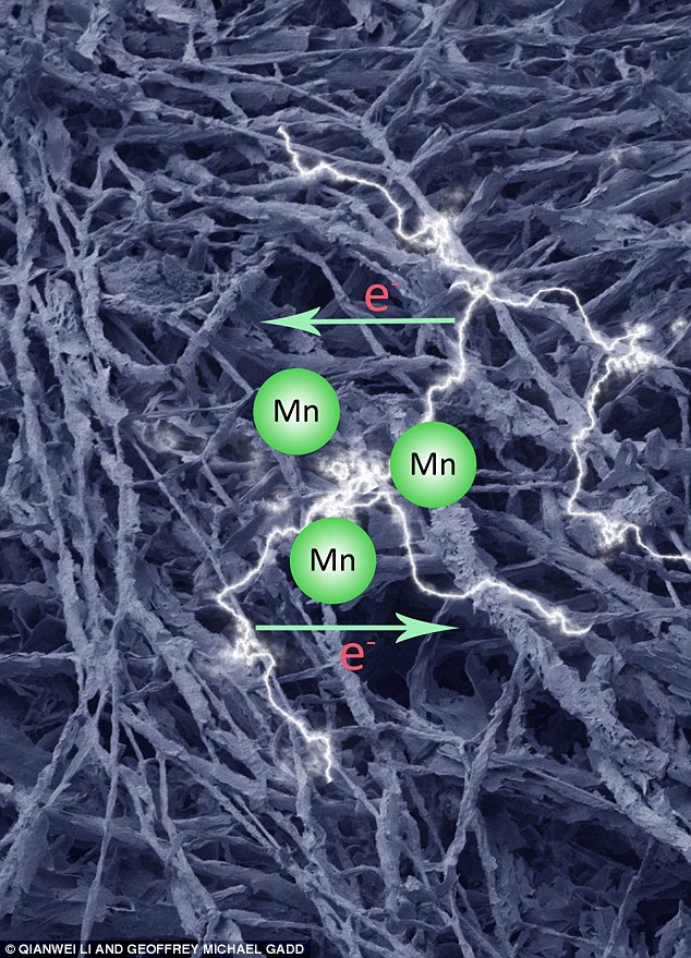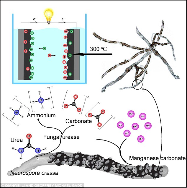 该科研团队将粗糙脉孢菌与一定量的氯化锰和其它一些物质混合进行实验。经过一段时间后,他们发现真菌菌丝体表面覆盖着大量的碳酸锰。然后,把形成的混合物在300℃热处理,得到了含有氧化锰的碳材料。