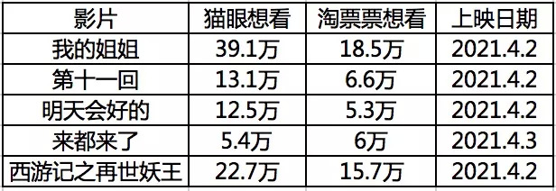 在《女儿国》市场不及预期之后,真人电影暂时搁浅,转战动画市场的《西游记之再世妖王》值得期待,目前的想看人数较高,整体热度仅次于《我的姐姐》,但从历史数据来看,这种较高的想看人数在真实转化成观看人数时,转化率会非常的低,最终还得寄望于影片的品质。