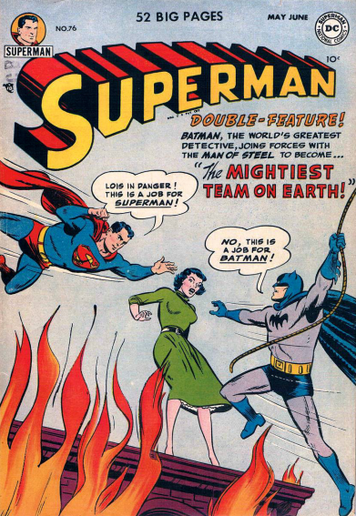 总之,广播剧是这两人伟大友谊的开端。接下来的几年中,两人的生活又没有太多交集了。直到1952年,在《超人》第76期上,两位英雄才正式在漫画中第一次相会。
