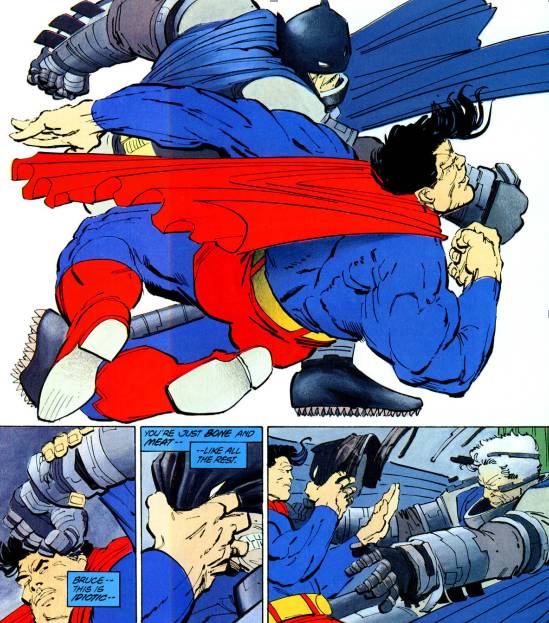 实际上书中的蝙蝠侠和超人都不在巅峰状态——蝙蝠侠早已不是那个体能臻于完美的最强普通人,而是垂垂老矣,伤病缠身;超人也受过核打击,并且因核冬天隔绝了阳光而被削弱不少。尽管如此,蝙蝠侠狠揍超人的一幕还是让读者们大吃一惊。