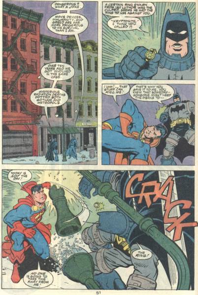 除了文戏的增加,超人和蝙蝠侠的对战也越来越多了,甚至开始出现泛滥的趋势,变成三五不时就出现一次的噱头。仅仅在《超人与蝙蝠侠》的连载中,他们就打了五场,这还不算同一时期其他系列里给他们安排的互殴。