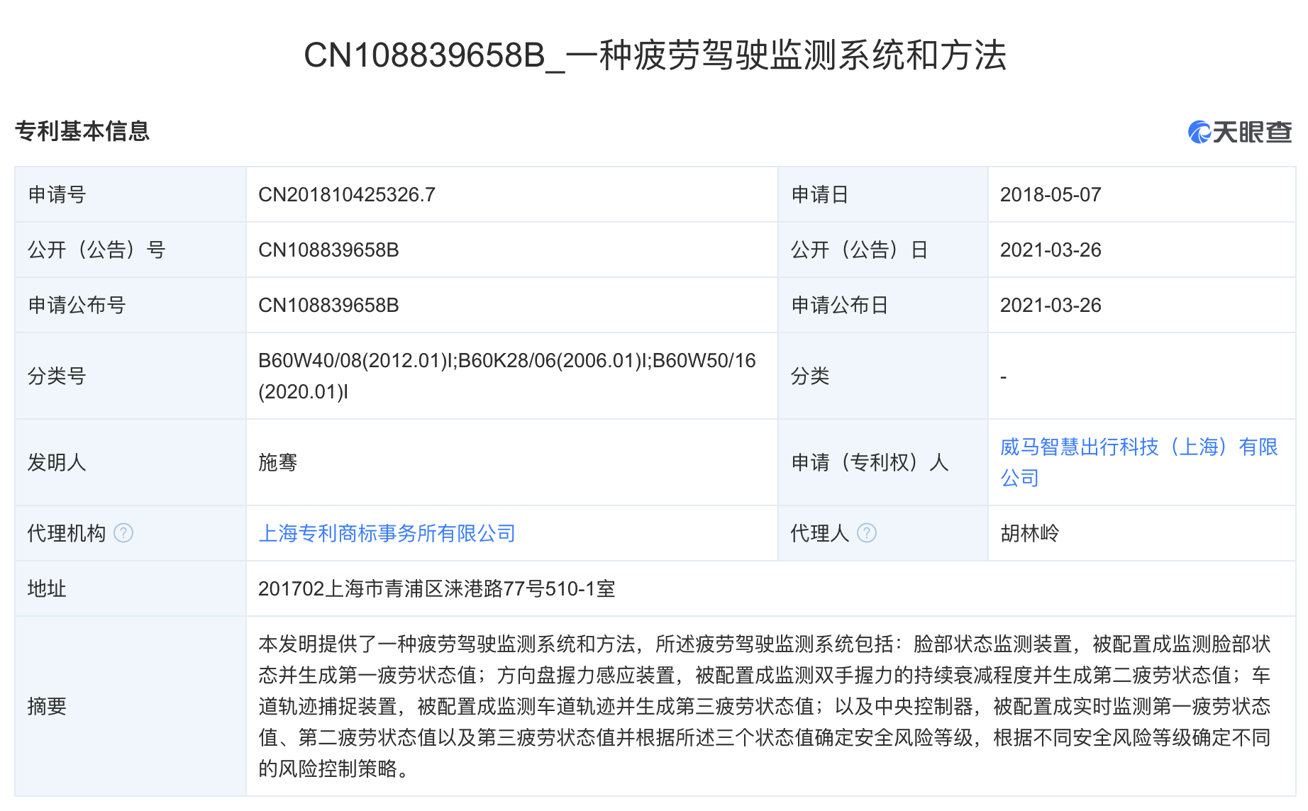 据天眼查APP显示,3月26日,威马智慧出行科技(上海)有限公司公开一项名为“一种疲劳驾驶监测系统和方法”的发明专利,公开号为CN108839658B,专利申请日期为2018年5月。