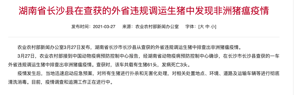 3月27日,农业农村部接到中国动物疫病预防控制中心报告,经湖南省动物疫病预防控制中心确诊,在长沙市长沙县查获的一车外省违规调运生猪中排查出非洲猪瘟疫情。查获时,该车共载有生猪61头,发病死亡3头。