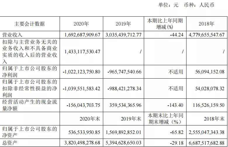 财报显示,去年鹿港文化实现营收16.93亿元,同比增减-44.24 %;归母净利润亏损10.22亿元,与去年基本持平。