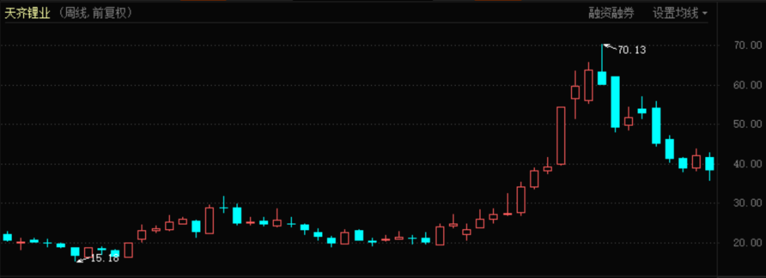 天齐锂业的股价从最高点的70.13元每股持续下跌,最低回撤至35.58元。