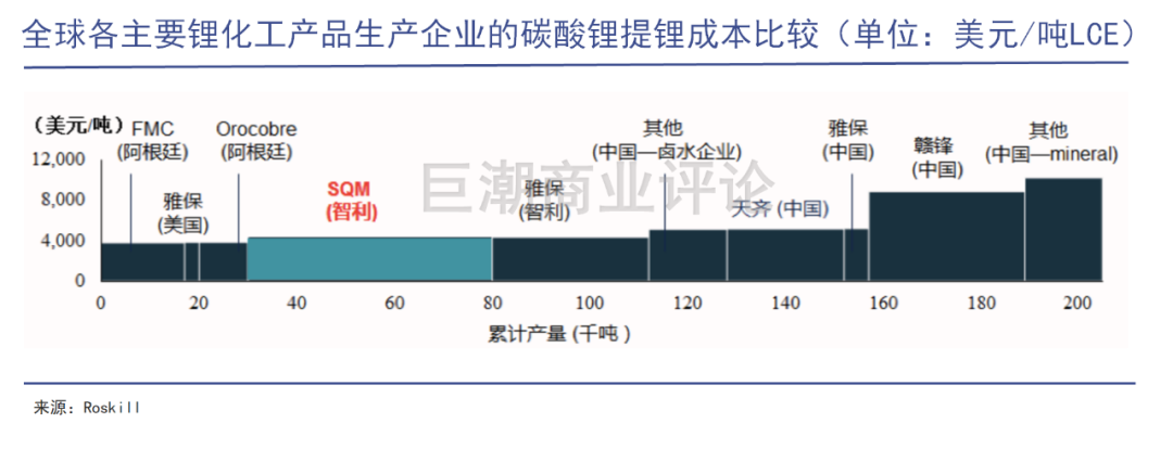机构Roskill的资料显示,天齐持有25.86%股权的SQM,其生产碳酸锂的提锂成本还不到赣锋锂业(SZ:002460)的一半。