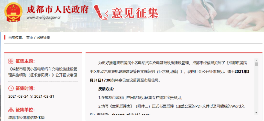 成都市人民政府官网近日发布《成都市居民小区电动汽车充电设施建设管理实施细则(征求意见稿)》(以下简称《征求意见稿》),目前正在向社会公开征求意见。3月31日17:00前将意见建议反馈至成都市经信局。