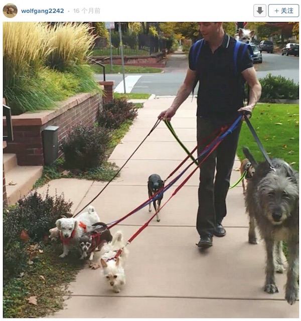 这么一大家子,遛起狗来队伍相当壮观。他手里攥着10来根绳子,所有的狗狗倾巢出动……