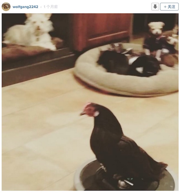 Steve的宠物里还有一只小鸡Oprah,它喜欢骑着扫地机器人在家里四处乱窜,像个常胜将军。
