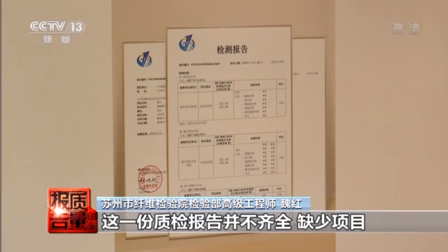 苏州市纤维检验院检验部高级工程师 魏红:它提供了质检的报告,其中对耐水色牢度、耐汗渍色牢度、耐干摩擦色牢度进行了质检,但是并没有对产品标准以及国家强制性标准的甲醛、PH值、偶氮、纤维含量等项目进行质检,可以看出这份质检报告并不齐全,但这一次我们的监督抽查检测过程中发现,它的纤维含量项目不合格。