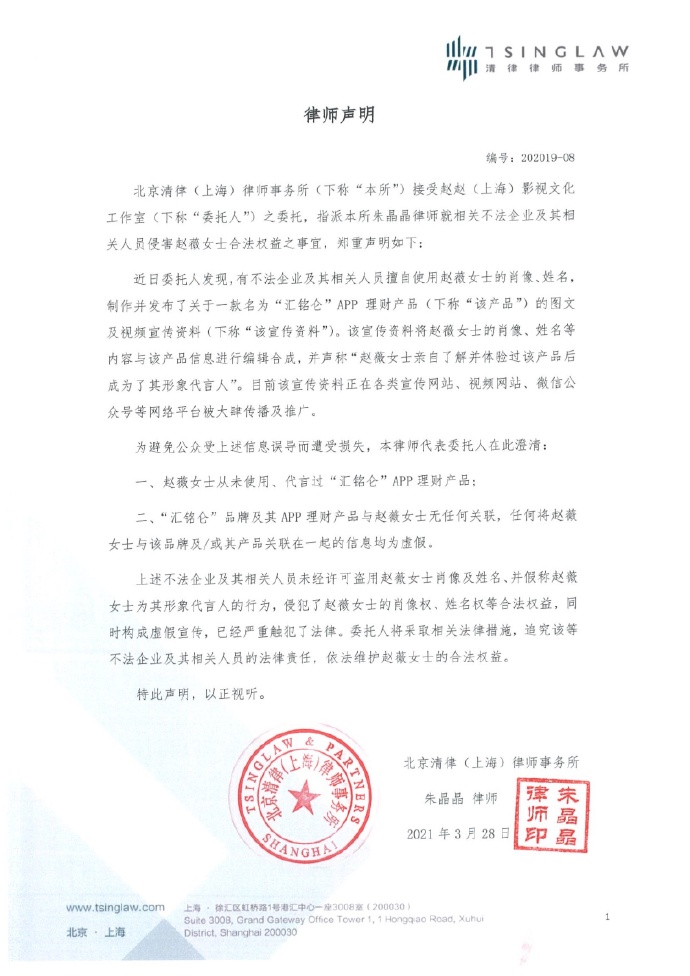 据@赵薇工作室 微博消息,3月28日,赵薇工作室发布声明称,赵薇从未使用、代言过“汇铭仑”APP理财产品,将追究其相关法律责任。