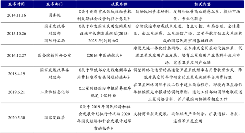 近年来,OneWeb、SpaceX 等公司的主导下,卫星互联网行业走上了快速发展期。从2014年起,我国针对该行业出台了一系列措施,积极推进卫星应用产业和商业卫星发展。特别是,国家发改委于 2020 年 4 月 20 日首次明确了“新基建”范围,包括信息基础设施、融合基础设施和创新基础设施三个方面。其中,信息基础设施主要是指基于新一代信息技术演化生成的基础设施,包括 5G、物联网、工业互联网和卫星互联网等。卫星互联网在国家层面首次被纳入通信网络基础设施范畴。