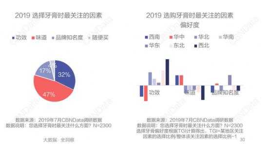 一些品牌在选择了细分的赛道之后,为了创新开始在牙膏香味上下功夫。CBNData调研发现,从地域来看,北方地区注重牙膏功效,华东则在意牙膏的品牌知名度,西南和华中的消费者更关注牙膏味道。