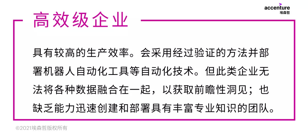 “未来级”企业极具敏捷性,他们通过打破信息孤岛并应用先进技术,在业务推出速度、产品/服务创新、营收状况、利益相关方体验、运营效率等方面实现着整体改善,并借助自动化技术和团队管理能力优化人才组合配置。