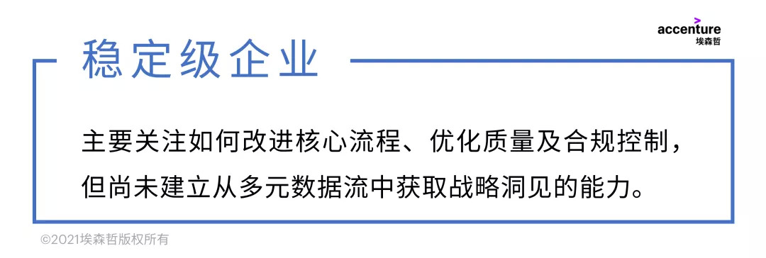 需要指出的是,通往“未来级”的并非只有华山一条路。即便是稳定级企业,也可直接实现跨越式进步。每家企业都可采取独有的方法,将技术、人才、数据和流程与自身经营战略相统一,改进其运营模式。