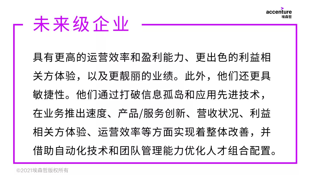 那么,中国企业该如何走完这最后一里路,真正实现成熟的企业运营?埃森哲通过调研,总结了“未来级”企业的成功之路。
