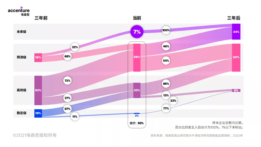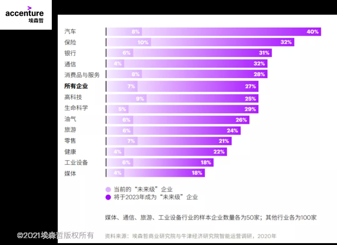 就低于“未来级”的企业而言,三分之一的高管希望于2023年之前,在运营模式中全面部署端到端的数字化流程,数量几乎是当前的五倍之多。而“未来级”企业中,38%正在扩大人工智能的应用规模,计划在三年内采取这一行动的比例更是达到了63%。