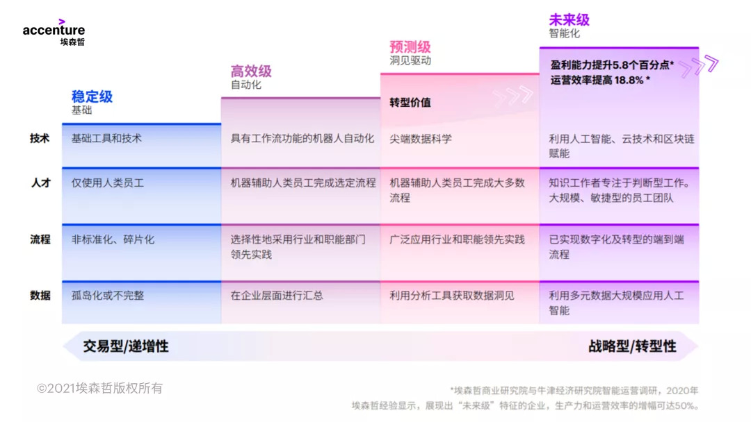 埃森哲中国企业数字转型指数发布之初,便以“创新驱动,高质发展”为主题,主张企业数字转型围绕智能运营、主营增长和商业创新三大价值维度进行,形成整个组织的协同效应,提升长期竞争力。企业如何才能实现智能运营?企业究竟处于运营成熟度的哪一阶段?如何才能加快步伐,为业务活动创造新的价值?