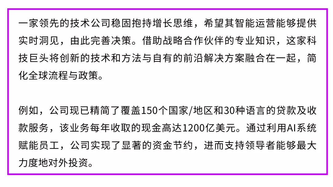 通过培养人机协作的员工团队,以技术赋能人员(而非人员迁就技术),企业能够合理分配工作,提升运营效率。此举有助员工腾出更多时间投入更具创造性和批判性的思考 这也是发现新价值来源的最佳途径。