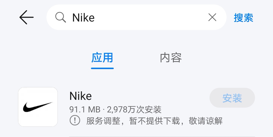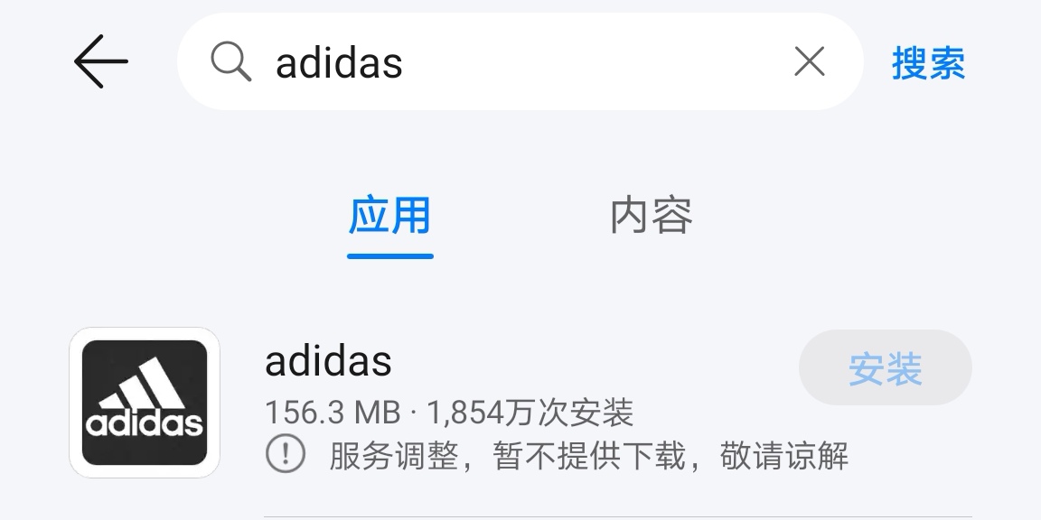 3月29日,界面新闻在华为应用市场搜索Nike、adidas,均提示“服务调整,暂不提供下载”,搜索耐克、阿迪达斯,也没有搜到相关APP。另据中国新闻网消息,腾讯应用宝、小米应用商店也搜不到Nike、adidas相关结果。