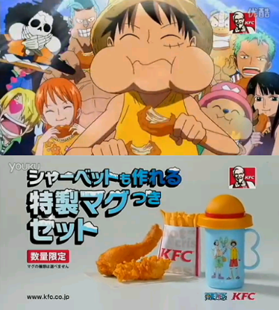 猛啃鸡腿的路飞和本体杯子,全片都是KFC的套路,国内无售。