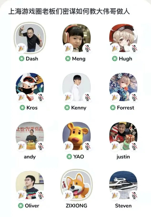 这个聊天室由心动的黄一孟做主持人,嘉宾有心动的戴云杰,米哈游的蔡浩宇、刘伟,莉莉丝王信文、张昊,巨人的吴萌,沐瞳的袁菁,飞鱼的姚剑军,英雄互娱的吴旦,FunPlus的钟英武等游戏公司的老板。