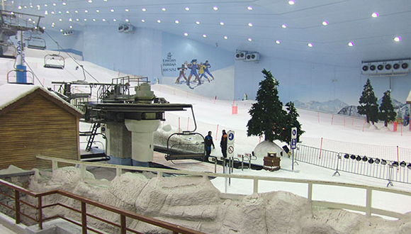 迪拜最大的室内滑雪场Ski Dubai,建在阿联酋购物中心旁边,外面是沙漠,屋里是滑雪场。