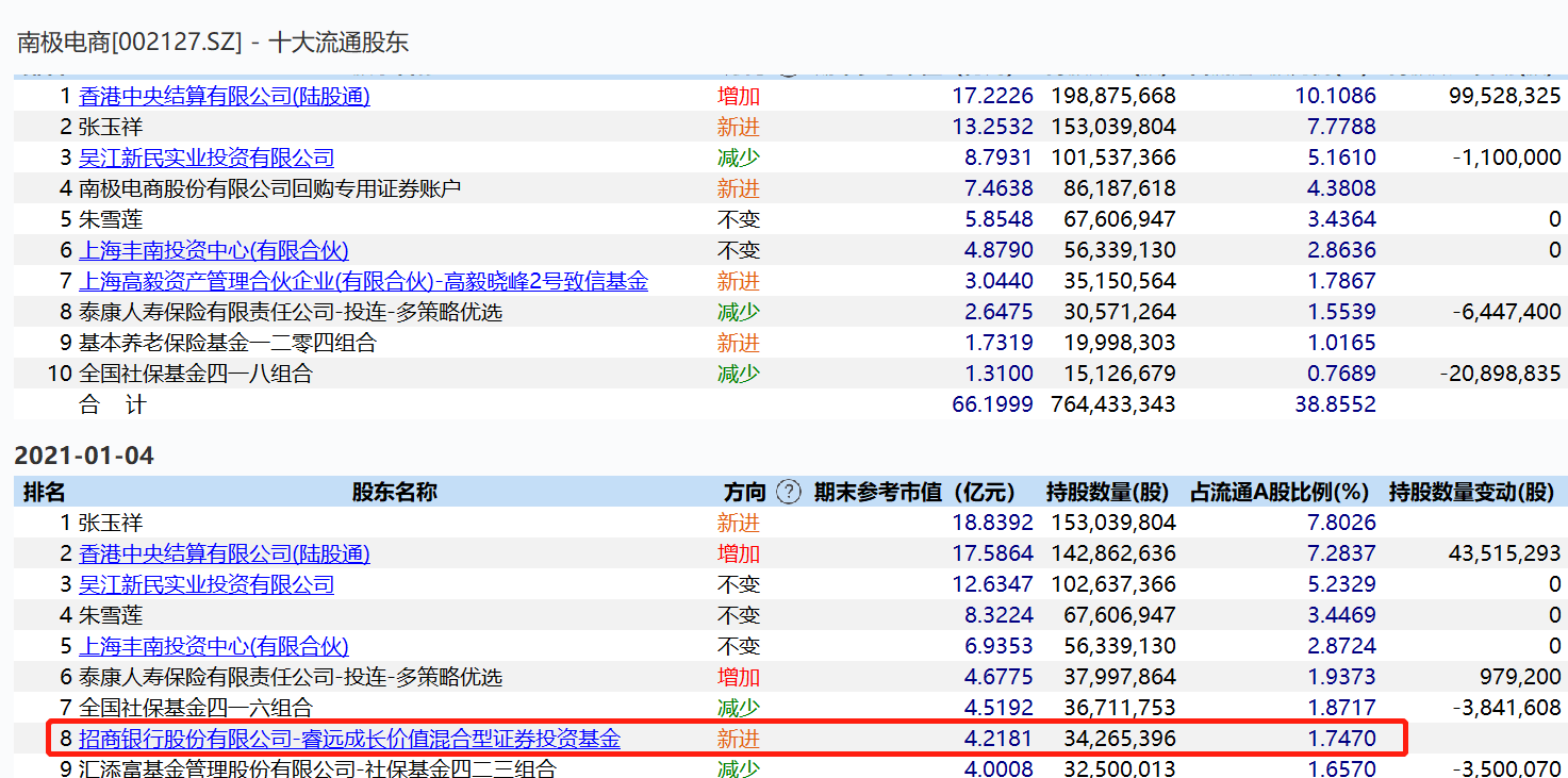 值得注意的是,截至2020年底,该基金持股南极电商(002127)3426.54万股,公允价值为4.69亿元,占基金资产净值比达1.54%,位居组合的第23位。而在2020 年中报,该基金持有数仅为179.9万股,公允价值为3808.55万元。