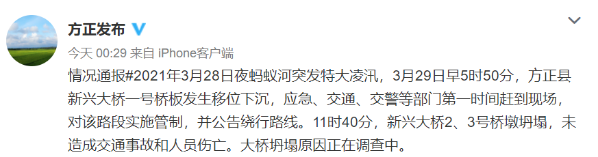 据@方正发布 微博消息,3月28日夜蚂蚁河突发特大凌汛,3月29日早5时50分,方正县新兴大桥一号桥板发生移位下沉,应急、交通、交警等部门第一时间赶到现场,对该路段实施管制,并公告绕行路线。11时40分,新兴大桥2、3号桥墩坍塌,未造成交通事故和人员伤亡。大桥坍塌原因正在调查中。