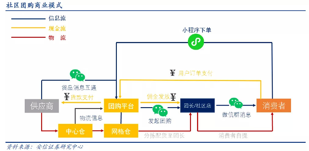 此外,社交软件所搭建的聊天环境,以及附带的支付功能,在社区团购的交易上,形成了脱离于传统电商APP的闭环,这才是真正的可怕之处:在初始信任的基础上,逐步获得客源,并在用户完成购买后,进一步形成转化和复购。