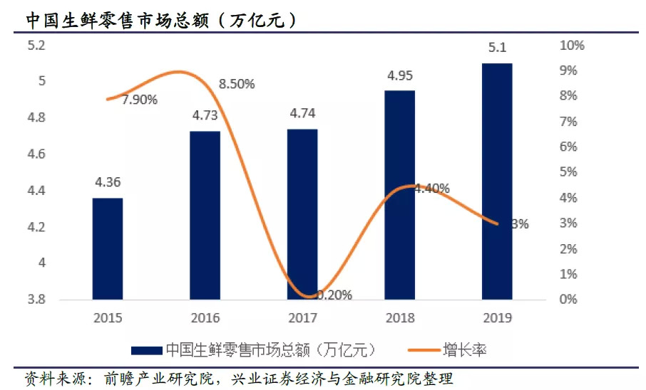 数据显示,中国生鲜零售市场的交易规模在2019年达到5.1万亿元,而且这个数据还在保持稳定增长态势,预计生鲜市场的增速将维持在3%左右。在5.1万亿的生鲜市场中,电商在2019年的市场规模约为2888亿元,同比增长 19.14%。