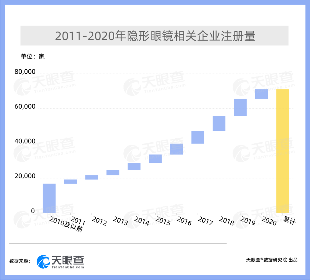 天眼查专业版数据显示,我国现有近5万家隐形眼镜相关企业,近4成分布在医疗健康行业。2011-2020这十年期间,我国隐形眼镜相关企业注册总量由原来的1.7万家增长至7.1万家,翻了两番。其中,2016年相关企业注册增速高达18.7%。