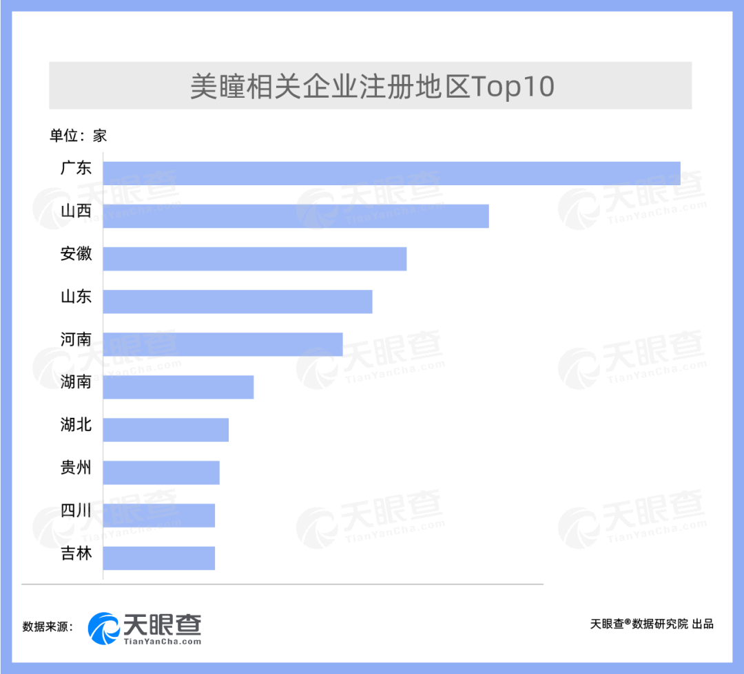天眼查专业版数据显示,我国现有超过1,500家美瞳相关企业。从地域分布来看,广东拥有数量最多的美瞳相关企业,超250家。同时,山西、安徽、山东、河南四省均有超过100家美瞳相关企业。
