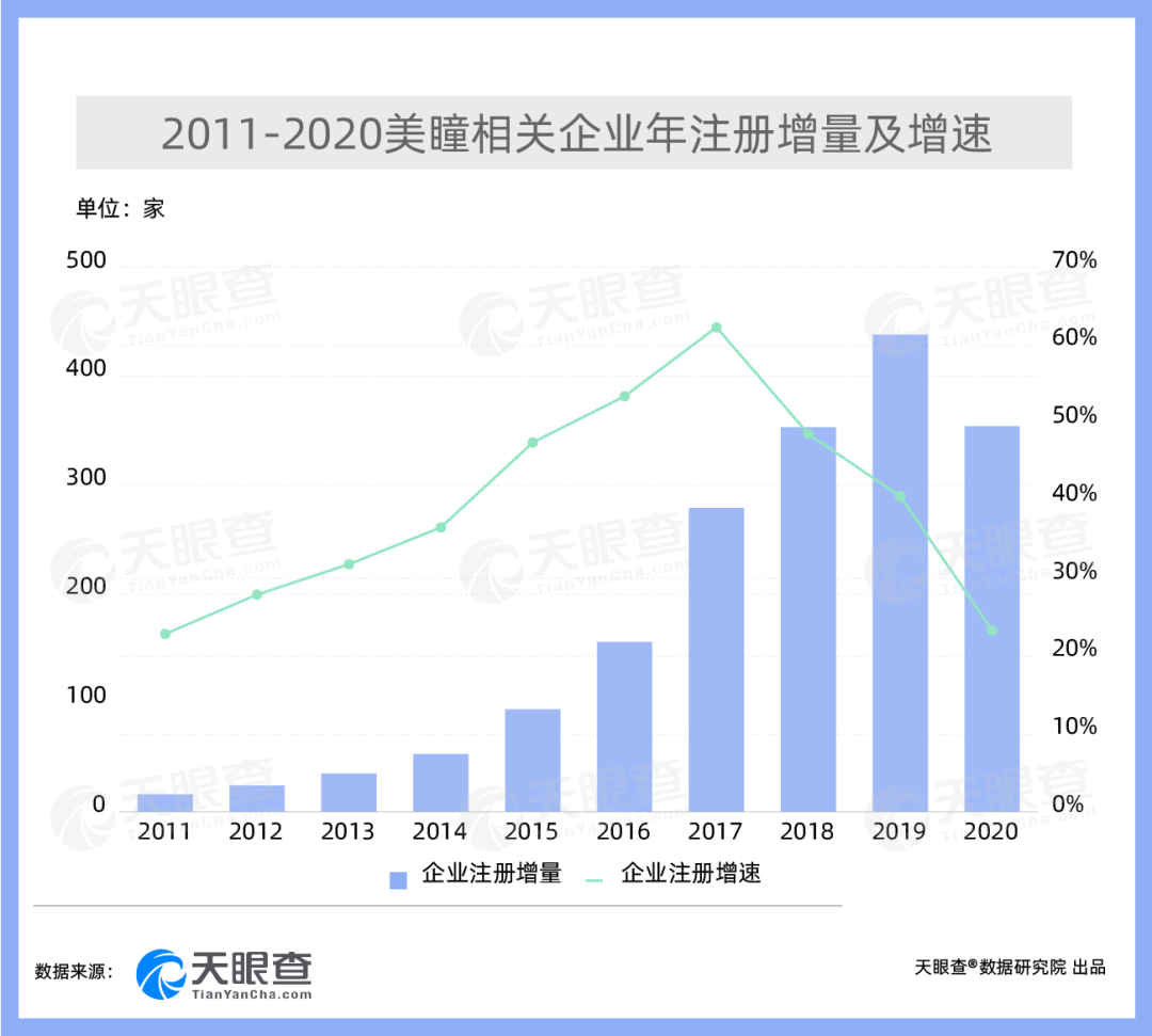 从相关企业注册情况来看,约84%的美瞳相关企业成立于近五年。具体来看,2015-2019年,美瞳相关企业年度注册增速均保持在40%以上,2020年相关企业注册增速虽只有23%,但年度新增企业也超过了350家。