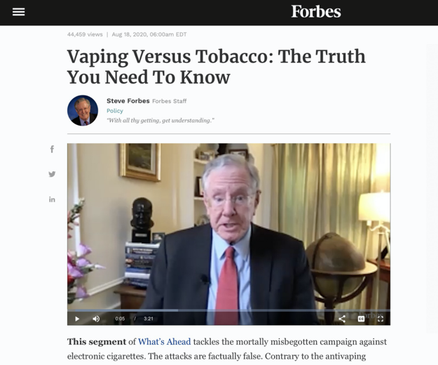 但这些声音通常都最终被证实缺乏科学实验与数据的支撑。2020年8月18日,福布斯媒体集团主席、《福布斯》总编辑Steve Forbes(史蒂夫·福布斯)在其最新一期的视频节目《What’s Ahead 》中指出,“反对电子烟的运动建立在大量错误信息和彻头彻尾的谎言之上”。