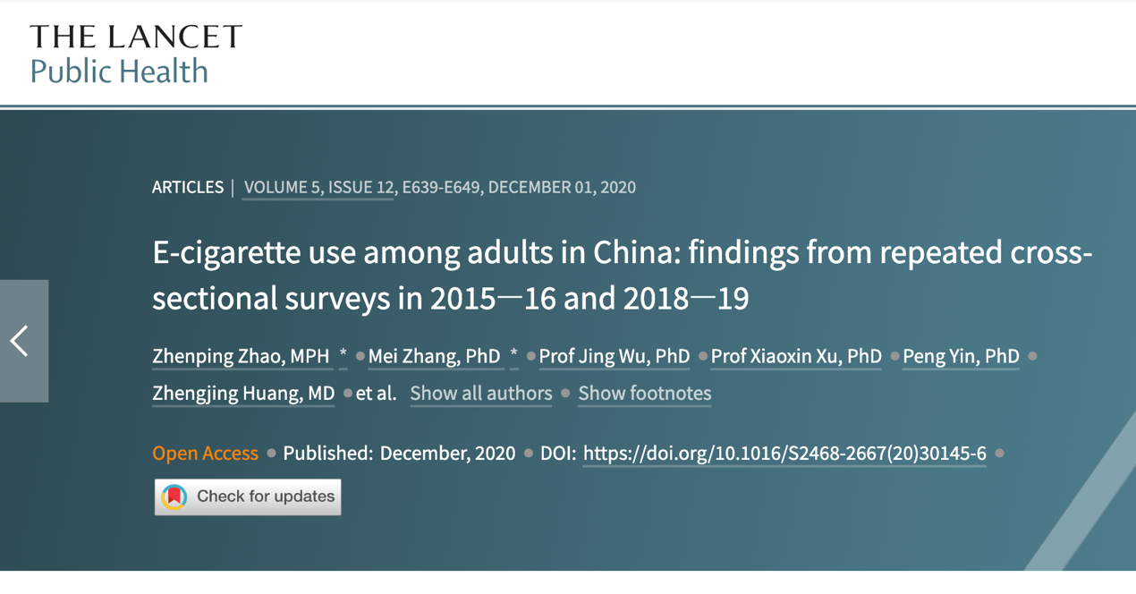 中国疾控中心发布在《柳叶刀》上的一篇论文证明,非烟民使用电子烟占比不足4%。
