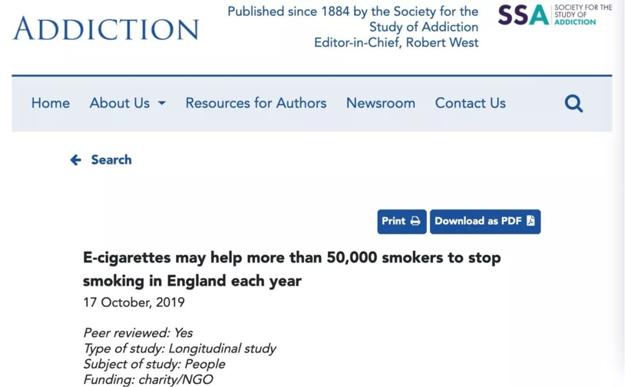 《瘾》发表的研究称,在英国,每年有超5万烟民在电子烟的帮助下戒烟。